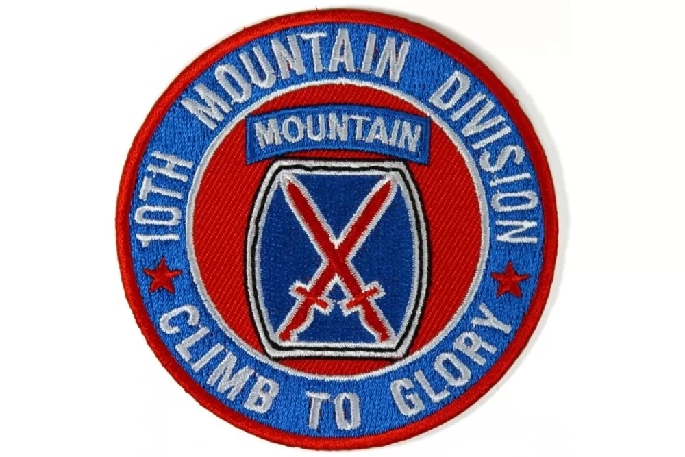 10th Mountain Division Patch Climb to Glory measures 3x3 inches and is Embroidered in Blue / Red / White. The Small Patch can be sewn on or ironed on to clothing such as Denim or Leather Jackets, Vests, Hats, Back Packs, Shirts. Features plastic backing and embroidered die cut borders.