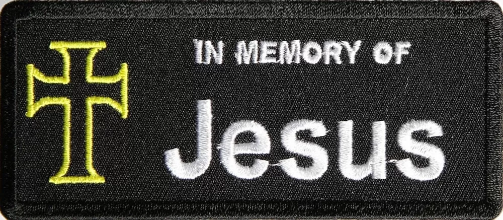 • In memory of Jesus patch measures 4x1.75 inches embroidered in white with a yellow Cross.