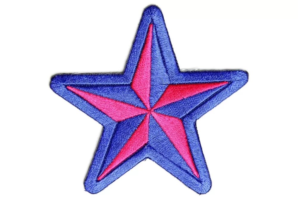 Blue and pink star patch measures 3x3 inches. Embroidered like a nautical star pattern in blue and pink. Also available in other colors.
