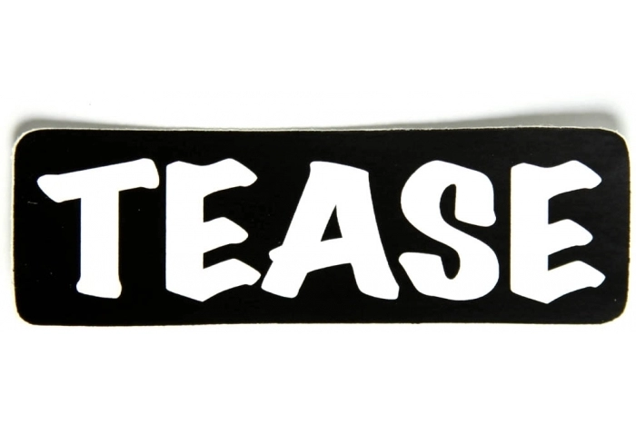 Tease sticker is small in size measuring 3.5x1 inches. Applied by simple peel and stick. The sticker is made of vinyl and will stretch over curves, can be applied to motorcycle or riding helmets. The sticker is weather resistant and made in USA.