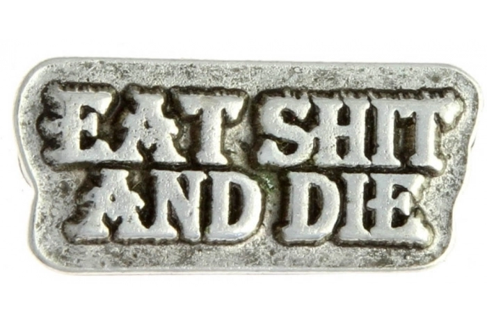 Eat Shit and Die pin is small in size. Attach it to your clothing with the pointy nail backs that come with standard clutches. The lead free pewter pin is made in the USA.
