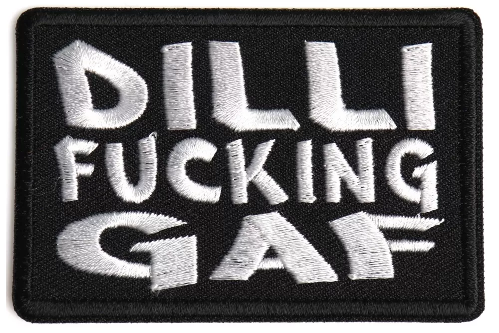 Dillifuckinggaf Patch measures 3x2 inches and is Embroidered in Black / White. The Small Patch can be sewn on or ironed on to clothing such as Denim or Leather Jackets, Vests, Hats, Back Packs, Shirts. Features plastic backing and embroidered die cut borders.