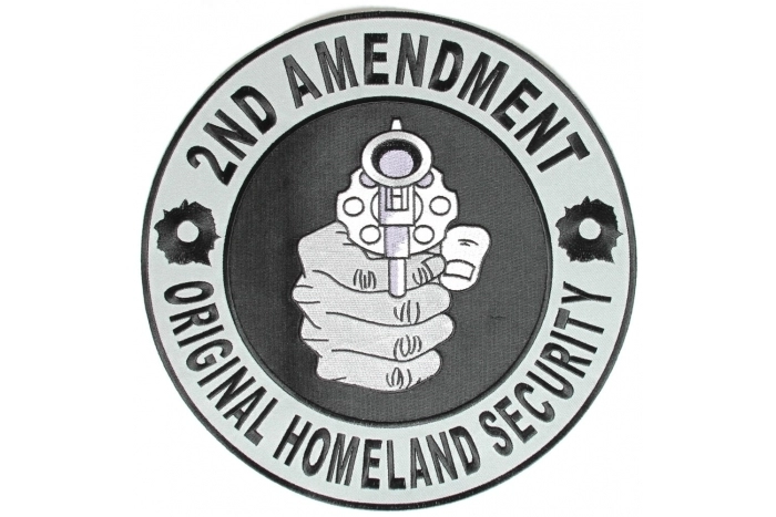 2nd Amendment Pointing Gun Large Patch is embroidered in Black / Gray / White. Measures 10x10 inches. The patch can be sewn or ironed on. Do not iron on patches to leather or nylon material.