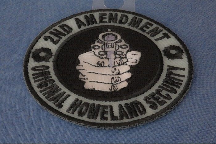 2nd Amendment round Original Homeland security patch is an embroidered iron on patch measuring 3x3 inch. Features a gun at point blank aiming at the person reading the patch. By far the most popular patch we carry. Apply to your clothing by ironing on or sewing it on. Please do not iron on patches to leather or nylon material. The patch features a nice embroidered die cut border making it easy to sew on when ironing on is not an option. Please remember using a household iron will not produce professional results. Both heat and pressure is required to adhere an iron on patch properly to a garment.