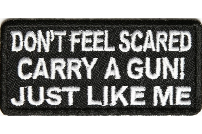 Are you scared? Well don't feel scared! Carry a gun just like me. Let everyone know you carry a gun with this patch. Perhaps will make the person reading it think twice about robbing or raping you. The iron on patch is embroidered in white over black and measures 3x1.5 inches. The patch features die cut borders for a clean look. You can sew it on to your leather vest or jacket, press it on to hats, shirts, jeans or even canvas belts. Start making your clothes unique with a patch and get some attention.