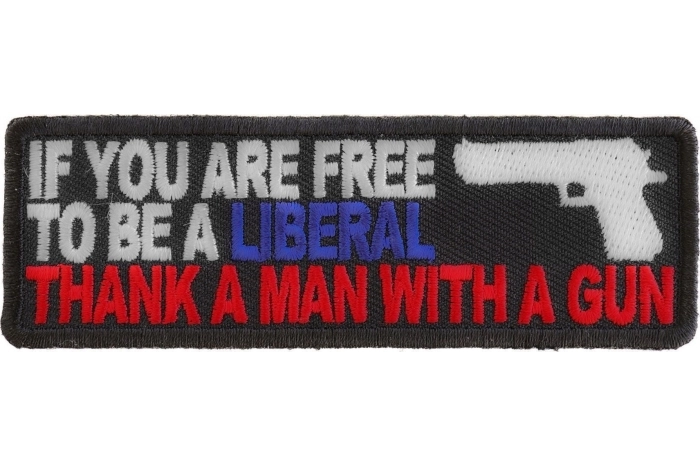 This is a great patch that says If you are free to be a liberal thank a man with a gun. Embroidered in our flag colors Red white and blue. Measures 4x1.25 inches. A gun is also embroidered on the patch.