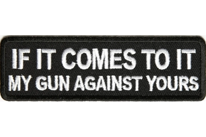 Let them know that if and when it comes to it, it will be your gun against theirs. I know I'm not going down without a fight. The iron on patch is embroidered in white over black and measures 4x1.25 inches. The patch features die cut borders for a clean look. You can sew it on to your leather vest or jacket, press it on to hats, shirts, jeans or even canvas belts. Start making your clothes unique with a patch and get some attention.