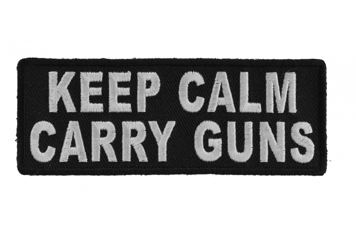 Keep Calm Carry Guns Patch measures 4x1.5 inches and is Embroidered in Black / White. The Small Patch can be sewn on or ironed on to clothing such as Denim or Leather Jackets, Vests, Hats, Back Packs, Shirts. Features plastic backing and embroidered die cut borders.
