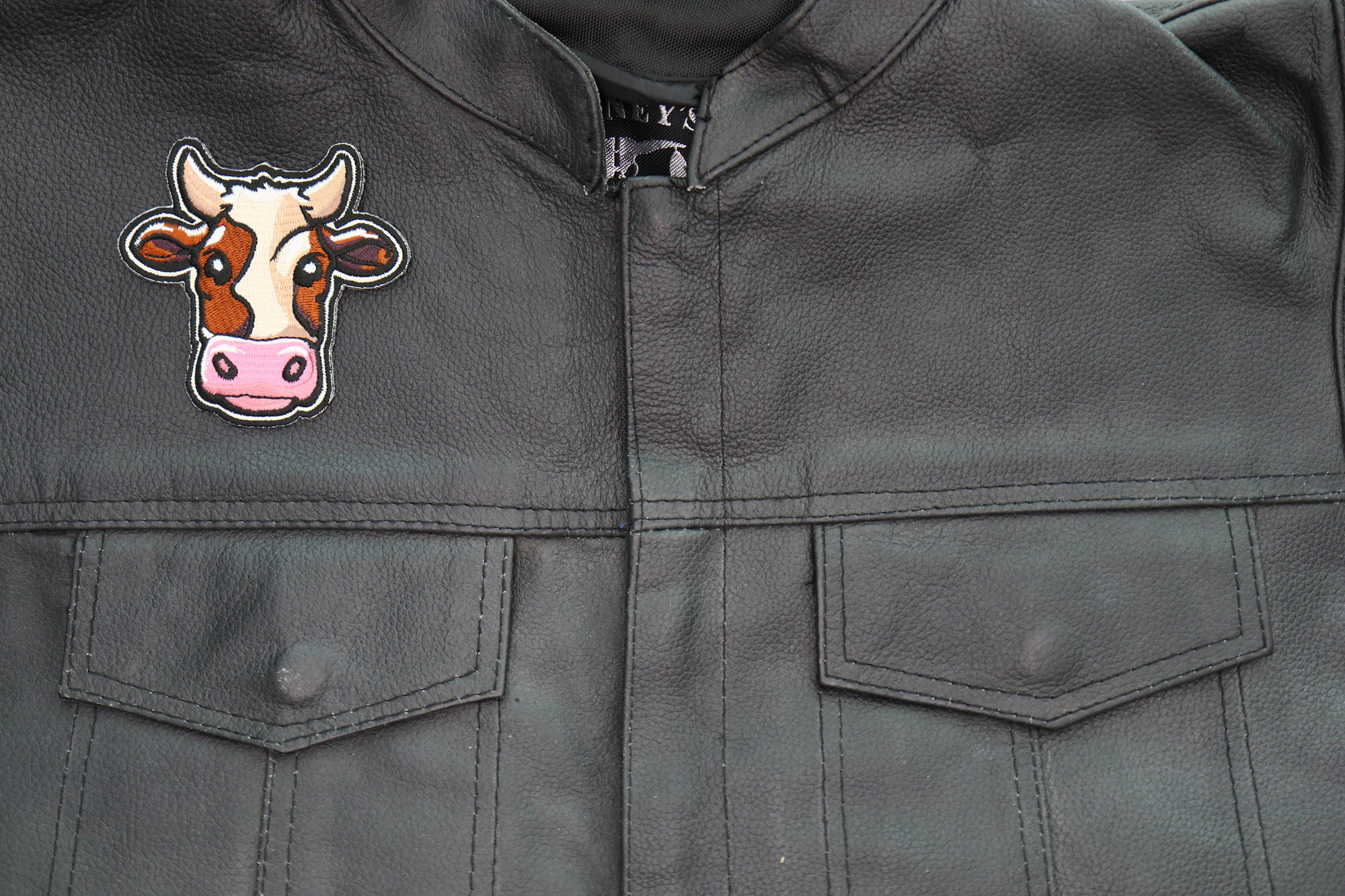 Cartoon Cow Patch measures 3.5x3.5 inches and is Embroidered in Black / White / Brown. The patch can be sewn on to Leather Biker Jackets, Vests or Chaps. The patch can also be ironed on to Shirts, Hats or Denim material such as Jeans. Features plastic iron on backing and clean laser cut embroidered borders. Japanese made iron on glue requires temperature between 270-290 Degrees Fahrenheit. Use a heat press for 30 seconds to adhere the patch permanently to your clothing. Using a regular household iron will probably not be as permanent as one hopes. If possible we recommend you sew on your patches for a more durable application. Never iron on patches to Leather or Nylon materials.