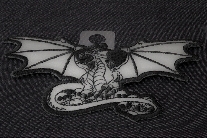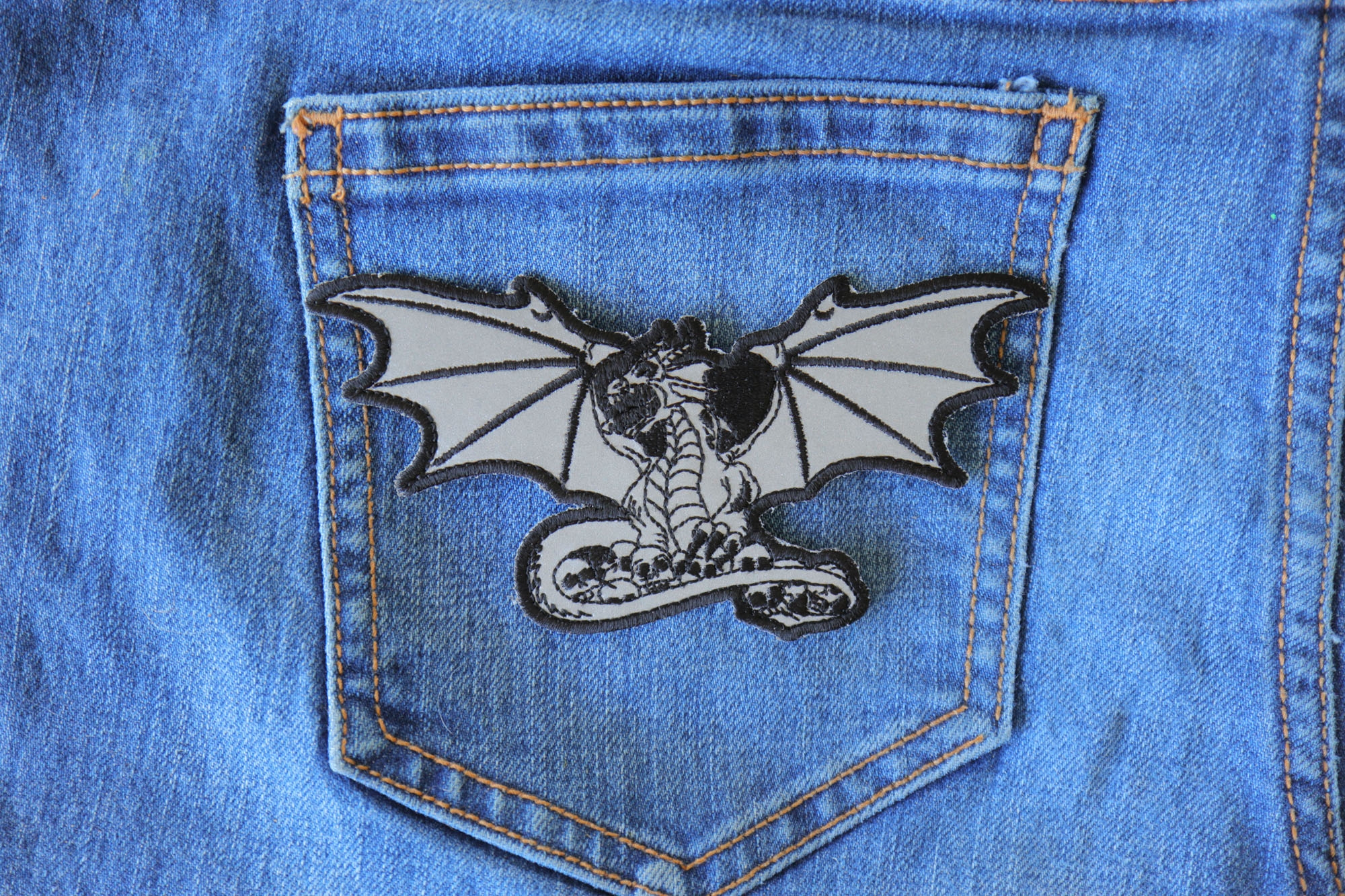 Dragon with Skulls Reflective Patch measures 5x2.5 inches and is Embroidered in Black / Reflective. The Small Patch can be sewn on or ironed on to clothing. You should sew patches on to leather jackets or vests. Refrain from ironing on patches to nylon or leather material. The correct iron on temperature is 270 degrees Fahrenheit. If you are using a household iron you should press down for 30 seconds. If you are using a heat press 12 seconds is sufficient. The patch features clean cut embroidered borders which will make it easy to sew on. We cannot recommend an iron setting which will yield you 270 degrees temperature. You can use a frying pan thermometer to find the correct setting of your iron. The temperature setting is very important. Plus or minus 10 degrees of variation is acceptable. But you should never go over 280 degrees Fahrenheit when ironing on the patch. Anything under 260 will also not activate the glue properly. The recommended 270 degrees Fahrenheit setting applies to all our iron on patches. We cannot speak for other manufacturers though. We spend the extra dime to use Japanese brand glue which works very well if applied at the right temperature.