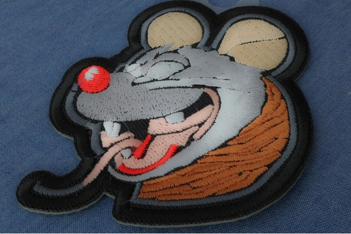 What we can't figure out is the brown around the rat's neck. Is it supposed to be a turtleneck sweater? Or maybe his head is protruding from a strategically placed hole in a wooden whiskey barrel. We don't really know. All we know is that this embroidered patch offers a ton of fun in a very small footprint.