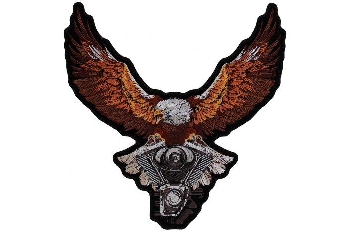 This embroidered Brown Eagle Over Engine Biker Back Patch can be applied to a variety of items to personalize your gear and clothing.