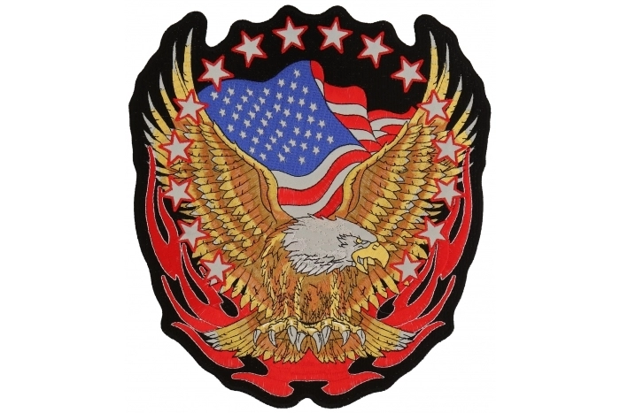 A nice embroidered reflective patch of an Eagle with raised wings, American flag waving in the background and tribal flames around it with reflective stars circling.