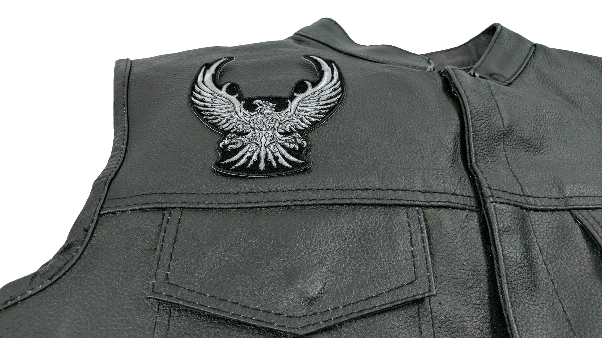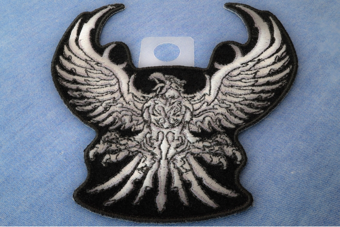 The 4x4 inch size Eagle patch features an upwing eagle drawn in tribal art and embroidered in shades of silver and grey.