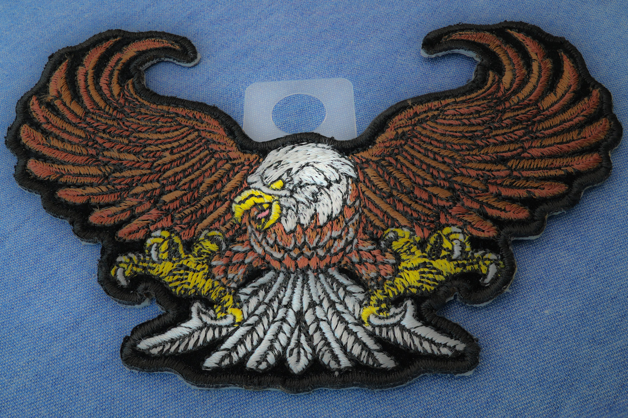 Brown Eagle Small Patch measures 4.5x3 inches and is Embroidered in Black / White / Brown / Yellow. The Small Patch can be sewn on or ironed on to clothing such as Denim or Leather Jackets, Vests, Hats, Back Packs, Shirts. Features plastic backing and embroidered die cut borders.