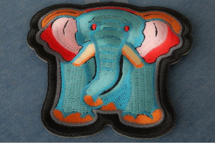 The patch is placed on a blue fabric surface, likely denim, which complements the blue tones in the elephant design. The overall shape of the patch is irregular, following the contours of the elephant's form, with a slightly rounded top and a wider base where the legs and trunk are positioned. This type of patch is typically used for decorative purposes, such as sewing onto clothing, bags, or jackets, to add a unique and colorful flair. The elephant design might symbolize strength, wisdom, or good luck, depending on the cultural context in which it's used.