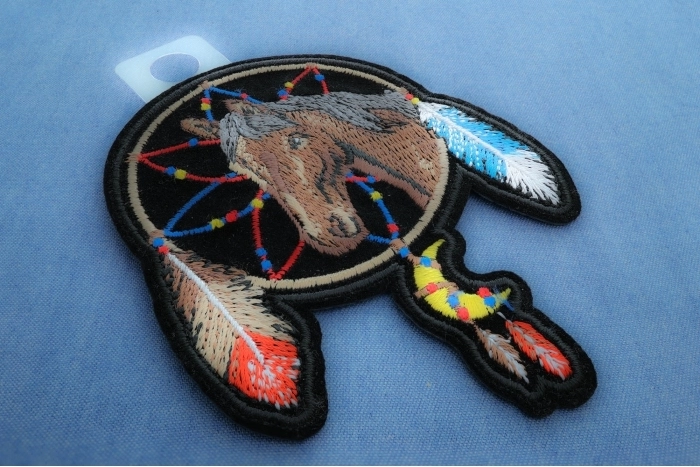 The embroidered patch in the image features a design inspired by a dreamcatcher, with a horse's head as the central element. The patch has a circular shape at the top, representing the dreamcatcher's hoop, and extends downward with feather-like elements, mimicking the traditional hanging feathers of a dreamcatcher.