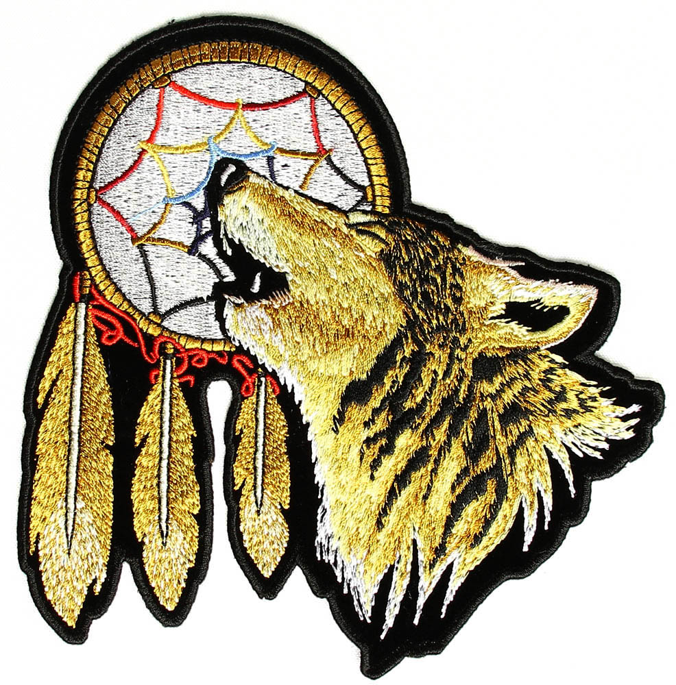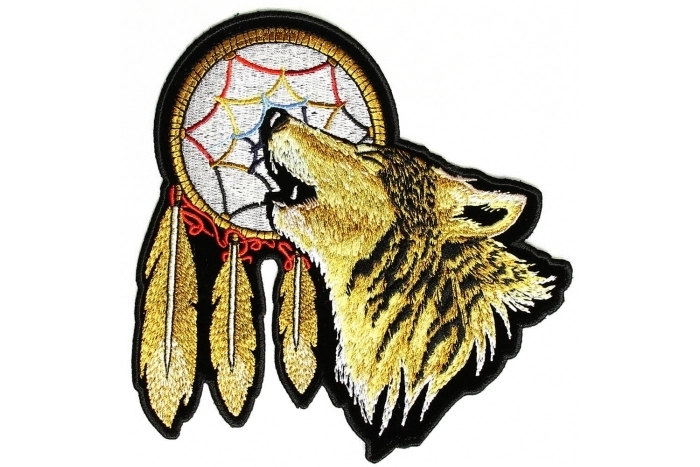 The howling wolf with the dreamcatcher and feathers in the background measures 6x6 inches in the medium version. Also available in a large back patch. A great Native indian embroidered patch design.