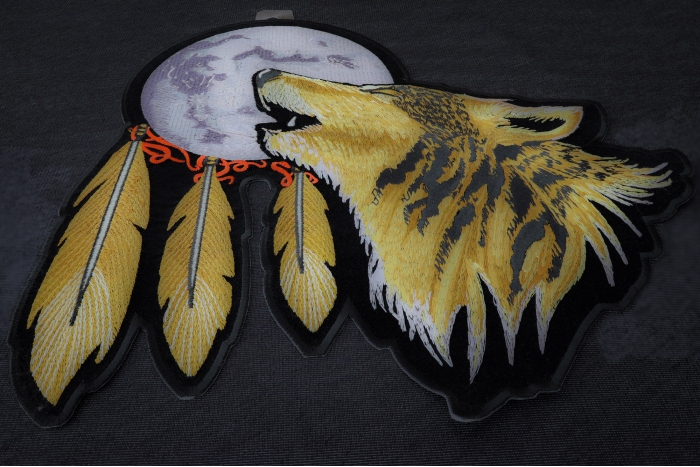 The large howling wolf patch with the moon on the background that has 3 feathers hanging down from it. Measures 12x12 inches. A great Native American design that'll fill up a huge portion once it is sewn on the back of your leather riding vest. This is one of our earliest designs from our artist Arturo Vilmenay. He is a biker and very talented when it comes to drawing us beautiful artworks. You'll see a lot of knock off versions of this design all over the internet. We assure you that this is the real deal here. One can tell from the quality of the embroidery that it was digitized going off the actual handmade drawing rather than being duplicated off an embroidered version.