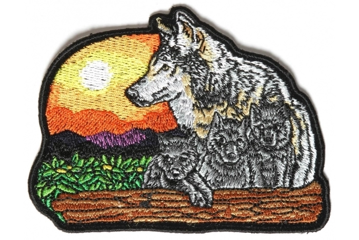 Wolf and Cubs Small Patch is embroidered in Gray / Brown / Green / Orange. Measures 4x3 inches. The patch can be sewn or ironed on. Do not iron on patches to leather or nylon material.