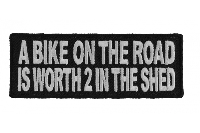 A bike on the road is worth 2 in the shed patch is embroidered in white over black and measures 4x1.5 inches.