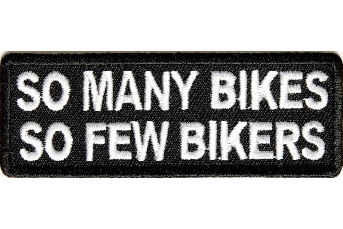 So Many Bikes So Few Bikers Patch. Embroidered with iron on backing. Measures 3.5x1.25 inches.