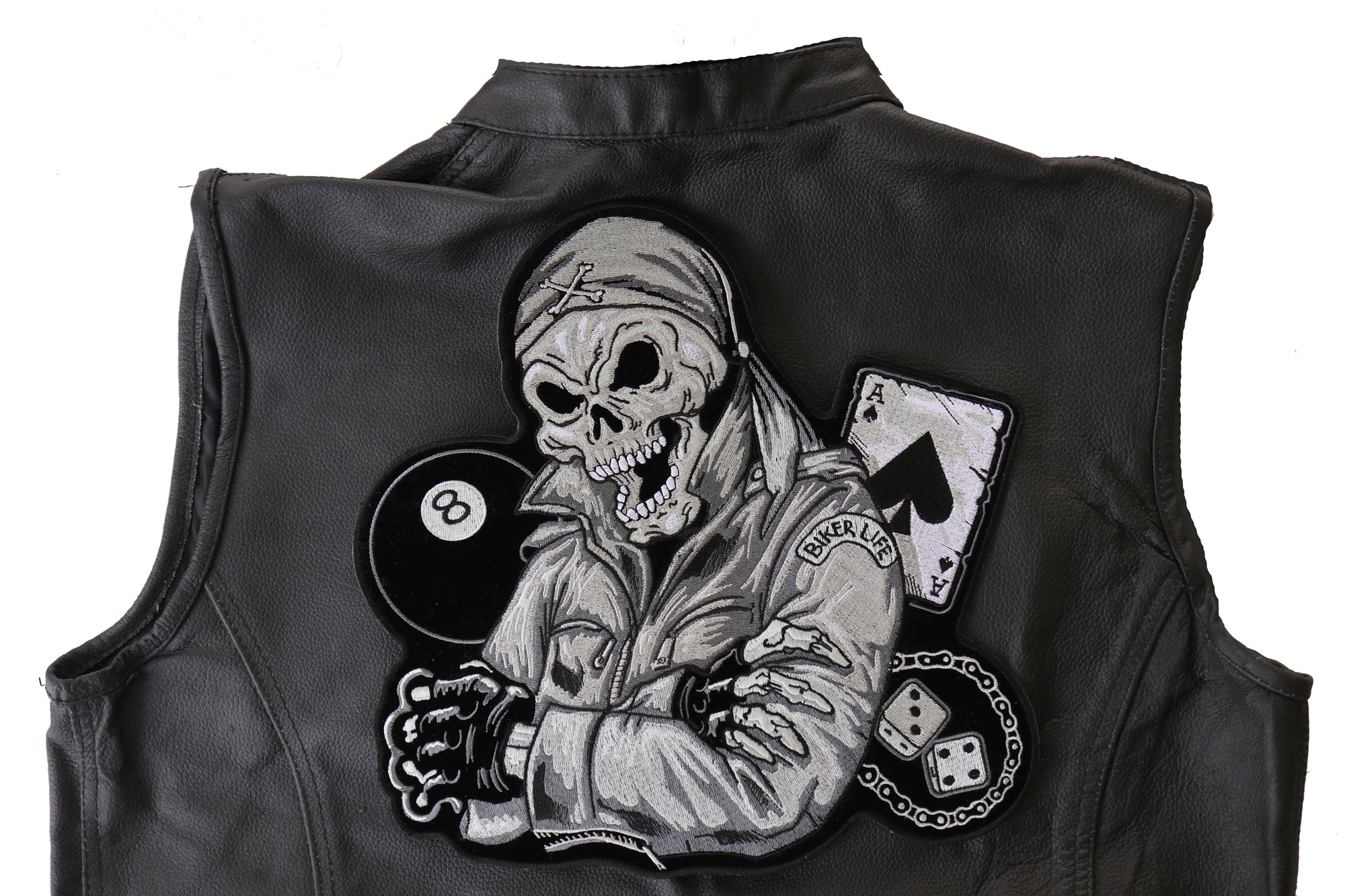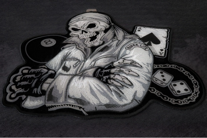 The Biker Dude Skull Patch is one of our top designs. We came out with this around 2014. The first version actually had some color in it and is probably still available at our site. But we know some people don't like color so we came out with a monochromatic version where we used different shades of black and gray to come up with an amazing looking design. This one you are looking at is the original ladies and gentlemen. This design is so popular that people are knocking them off but they cannot get it right the way we have done it.