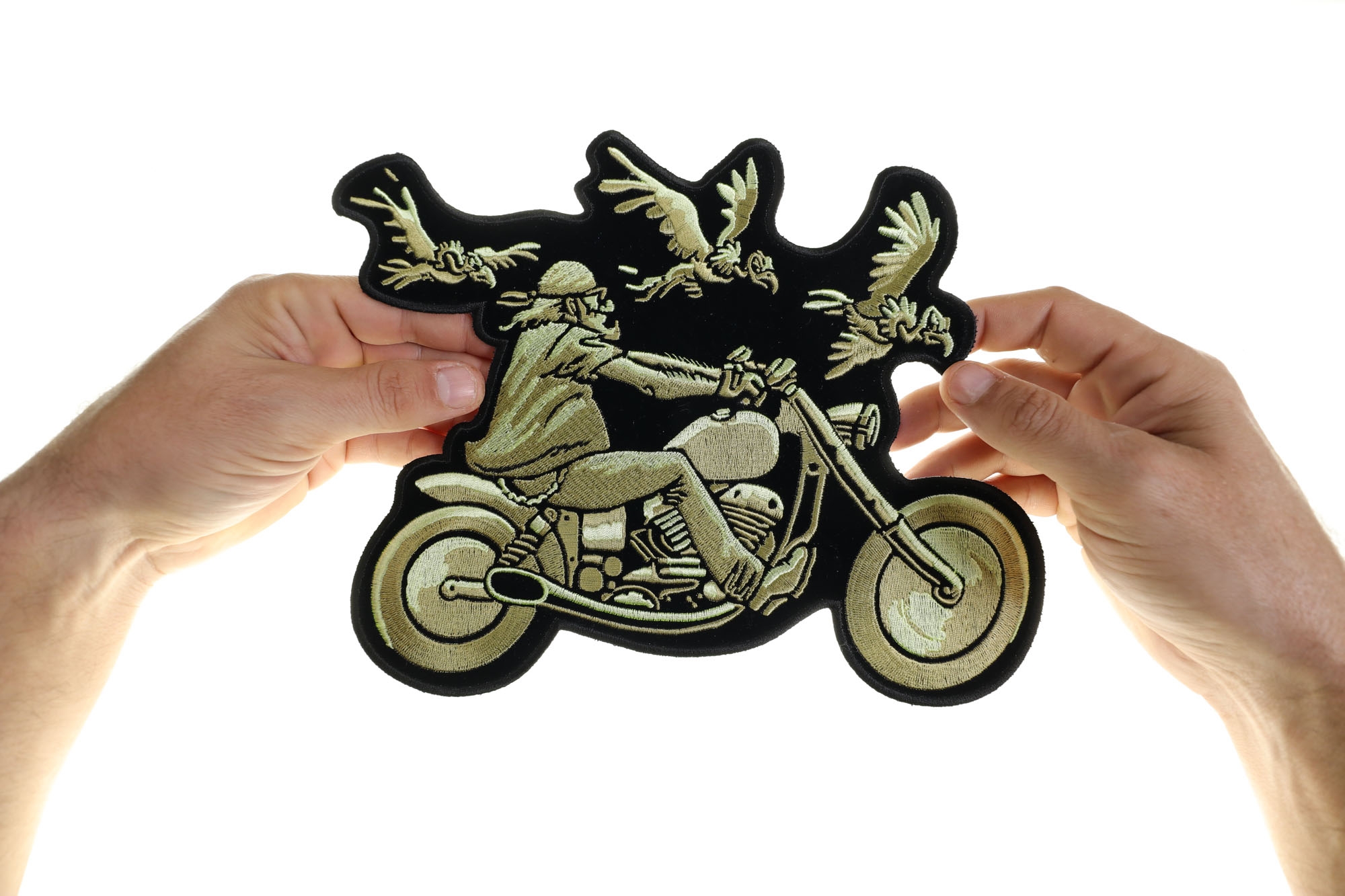 This nice large biker patch measures 10x8 inches. Embroidered in tan colors the patch has 3 Turkey Vultures circling a Biker Riding his motorcycle. Designed by Arturo Vilmenay, also available as a small patch