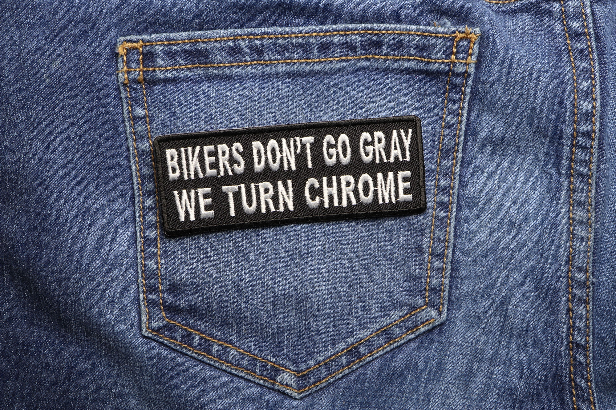 Bikers Don't Go Gray We Turn Chrome Patch measures 4x1.5 inches and is Embroidered in Black / White. The Small Patch can be sewn on or ironed on to clothing such as Denim or Leather Jackets, Vests, Hats, Back Packs, Shirts. Features plastic backing and embroidered die cut borders.