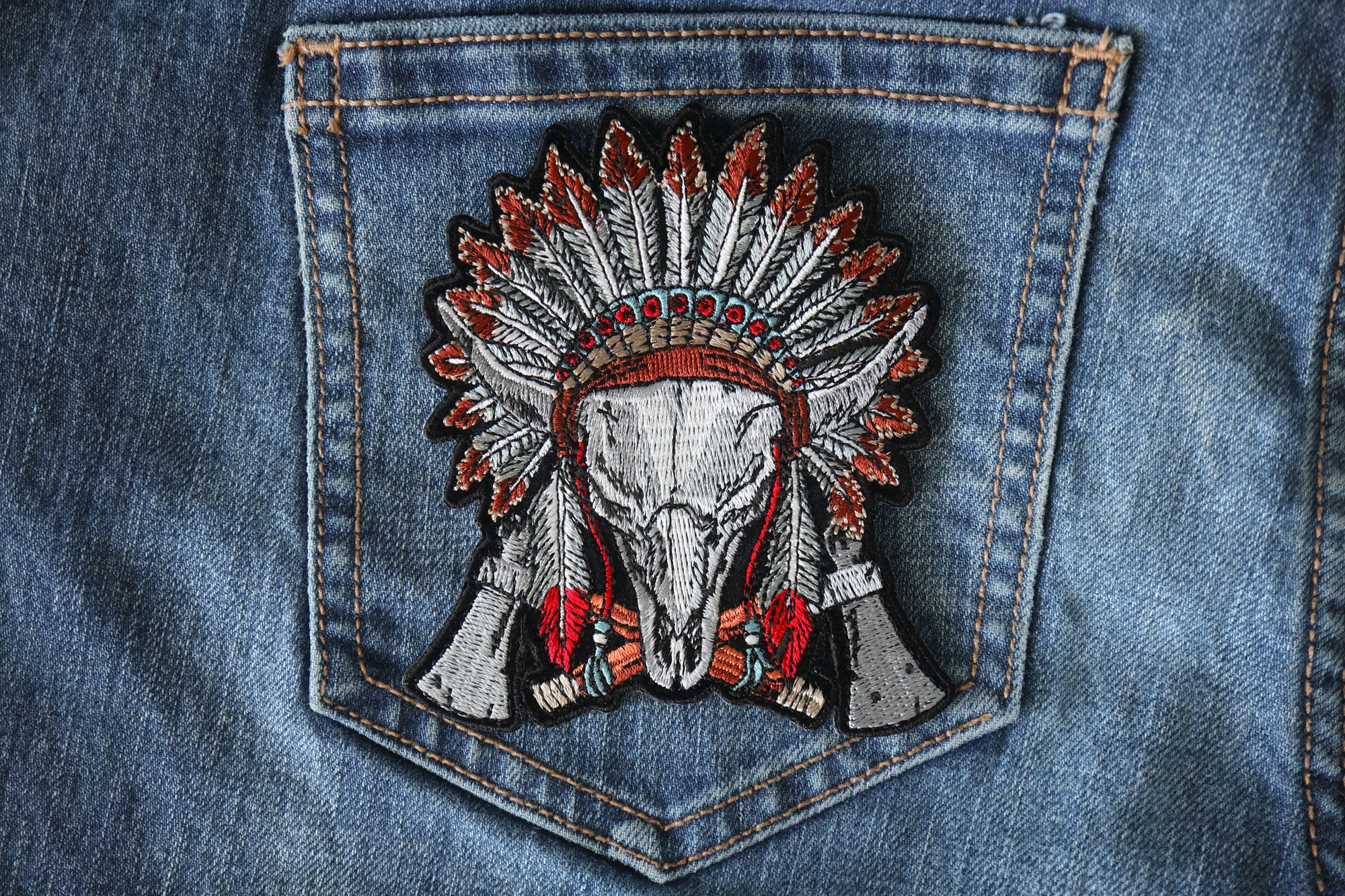 Buffalo Skull Indian Head Dress Axes Small Iron on Patch measures 3.5x4 inches and is Embroidered in Black / White / Red / Brown. The Small can be sewn on or ironed on to clothing. The Buffalo Skull Indian Head Dress Axes Small Iron on Patch features plastic iron on backing and clean laser cut embroidered borders.