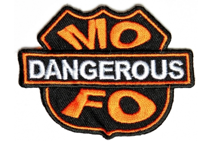 Dangerous MO FO Fun Patch measures 3x2.25 inches and is Embroidered in Black / White / Orange. The Small Patch can be sewn on or ironed on to clothing such as Denim or Leather Jackets, Vests, Hats, Back Packs, Shirts. Features plastic backing and embroidered die cut borders.
