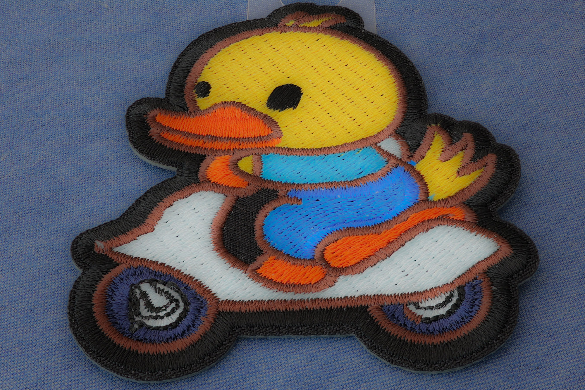 Duck on Board Bike Iron on Patch measures 2.5x3 inches and is Embroidered in Black / Yellow / Blue. The patch can be sewn on to Leather Biker Jackets, Vests or Chaps. The patch can also be ironed on to Shirts, Hats or Denim material such as Jeans. Features plastic iron on backing and clean laser cut embroidered borders. Japanese made iron on glue requires temperature between 270-290 Degrees Fahrenheit. Use a heat press for 30 seconds to adhere the patch permanently to your clothing. Using a regular household iron will probably not be as permanent as one hopes. If possible we recommend you sew on your patches for a more durable application. Never iron on patches to Leather or Nylon materials.