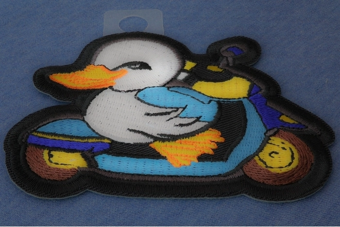 Duck Rider Iron on Patch measures 3.75x3 inches and is Embroidered in Black / Yellow / Blue. The patch can be sewn on to Leather Biker Jackets, Vests or Chaps. The patch can also be ironed on to Shirts, Hats or Denim material such as Jeans. Features plastic iron on backing and clean laser cut embroidered borders. Japanese made iron on glue requires temperature between 270-290 Degrees Fahrenheit. Use a heat press for 30 seconds to adhere the patch permanently to your clothing. Using a regular household iron will probably not be as permanent as one hopes. If possible we recommend you sew on your patches for a more durable application. Never iron on patches to Leather or Nylon materials.