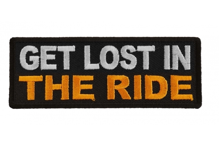 Get Lost in The Ride Patch measures 4x1.5 inches and is Embroidered in Black / White. The Small Patch can be sewn on or ironed on to clothing such as Denim or Leather Jackets, Vests, Hats, Back Packs, Shirts. Features plastic backing and embroidered die cut borders.