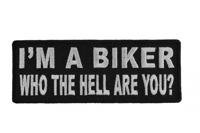 I'm a Biker Who The Hell Are you Patch measures 4x1.5 inches and is Embroidered in Black / White. The Small Patch can be sewn on or ironed on to clothing such as Denim or Leather Jackets, Vests, Hats, Back Packs, Shirts. Features plastic backing and embroidered die cut borders.