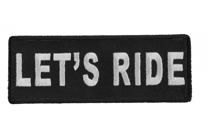 Let's Ride Patch measures 4x1.5 inches and is Embroidered in Black / White. The Small Patch can be sewn on or ironed on to clothing such as Denim or Leather Jackets, Vests, Hats, Back Packs, Shirts. Features plastic backing and embroidered die cut borders.