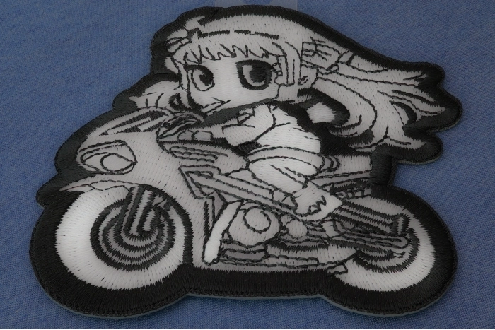 Little Girl Biker Patch measures 3.5x4 inches and is Embroidered in Black / White. The patch can be sewn on to Leather Biker Jackets, Vests or Chaps. The patch can also be ironed on to Shirts, Hats or Denim material such as Jeans. Features plastic iron on backing and clean laser cut embroidered borders. Japanese made iron on glue requires temperature between 270-290 Degrees Fahrenheit. Use a heat press for 30 seconds to adhere the patch permanently to your clothing. Using a regular household iron will probably not be as permanent as one hopes. If possible we recommend you sew on your patches for a more durable application. Never iron on patches to Leather or Nylon materials.