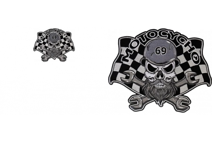 - Motocycho Checkered Flag Skull Biker Patch Small and Large Set Combo