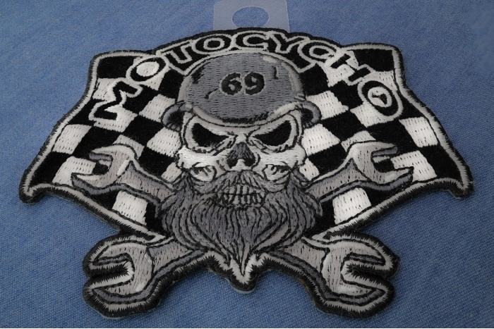 Motocycho Skull Patch Small measures 4x3.3 inches and is Embroidered in Black / White / Gray. The Small can be sewn on or ironed on to clothing. The Motocycho Skull Patch Small features plastic iron on backing and clean laser cut embroidered borders.