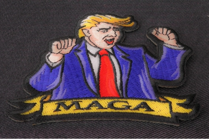 This is a vibrant, small embroidered patch featuring a stylized cartoon depiction of a man with distinctive blond hair, wearing a blue suit, white shirt, and red tie. The figure is shown with raised fists, an open mouth, and an energetic expression, suggesting excitement or celebration. Below the figure, a yellow banner with black lettering proudly displays the acronym "MAGA," which stands for "Make America Great Again." The patch is outlined in black stitching, giving it a bold, defined edge, and the colorful embroidery creates a striking, eye-catching design. Measuring roughly 3.5 inches in size, this patch is ideal for attaching to clothing, bags, or hats, serving as a bold statement piece with a political or cultural flair.