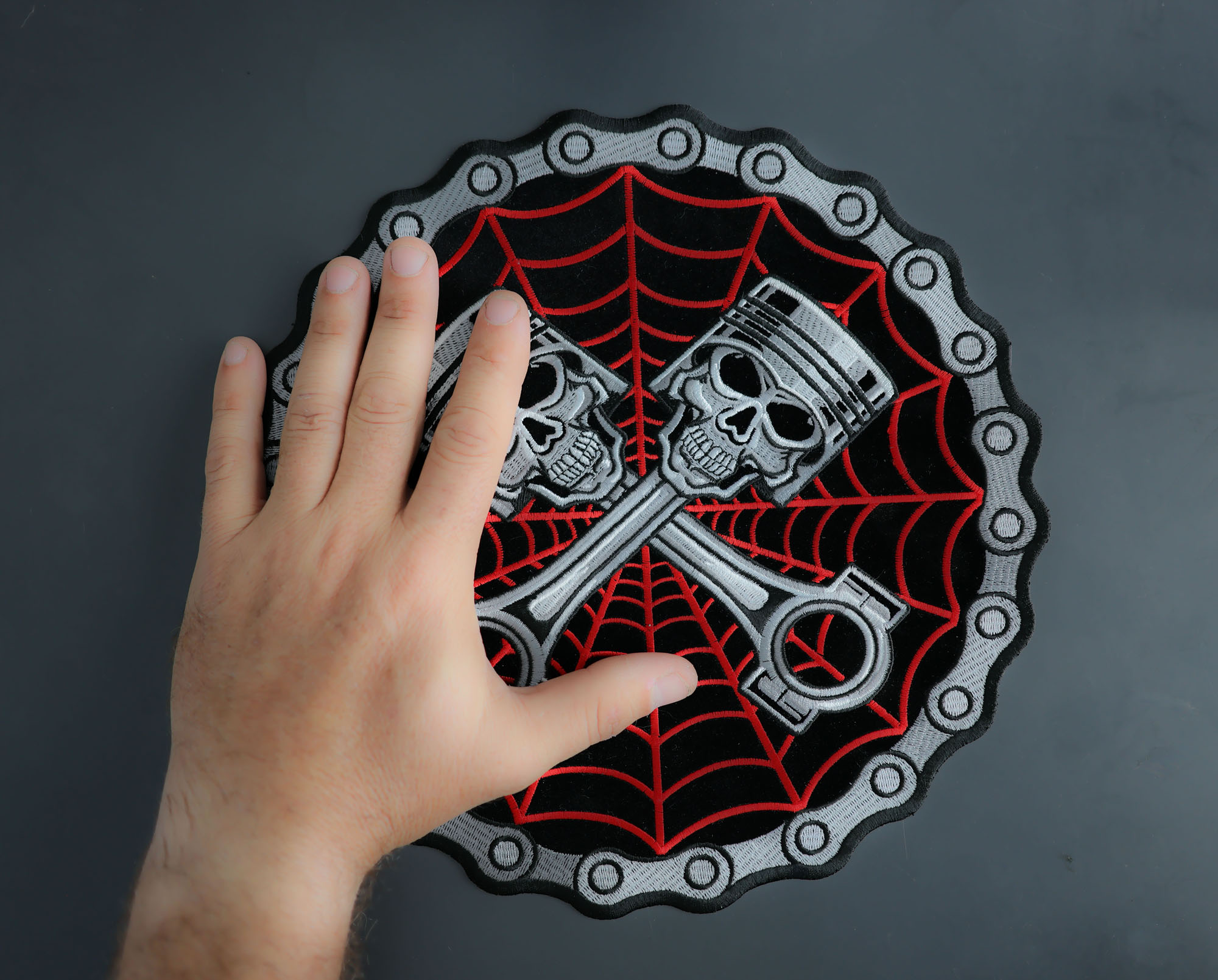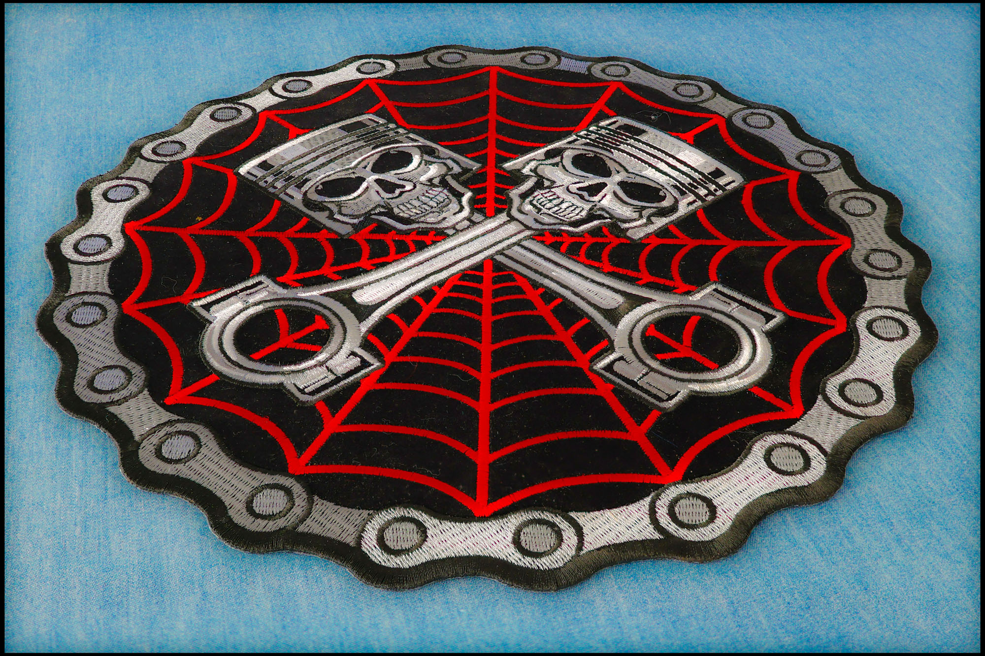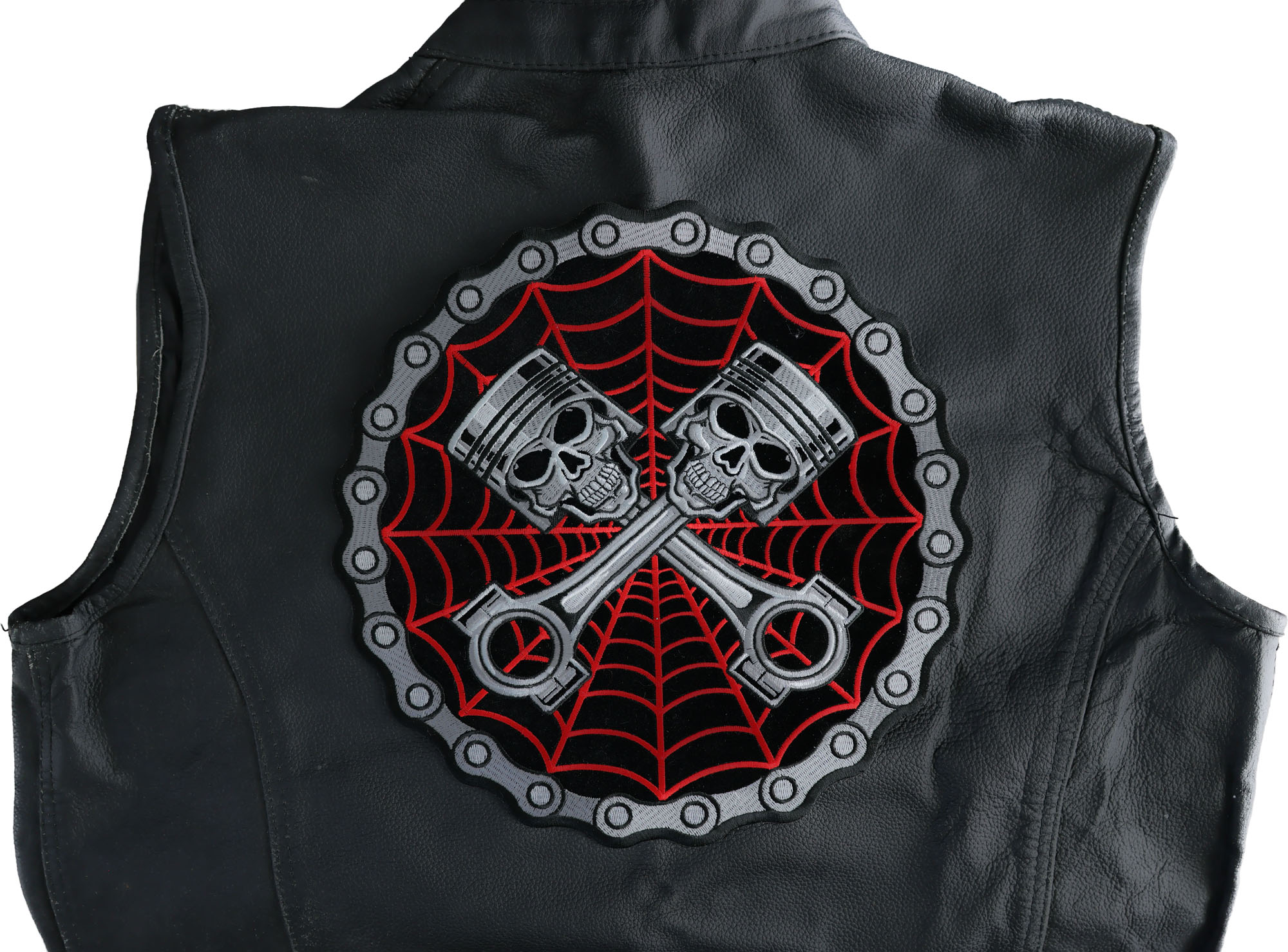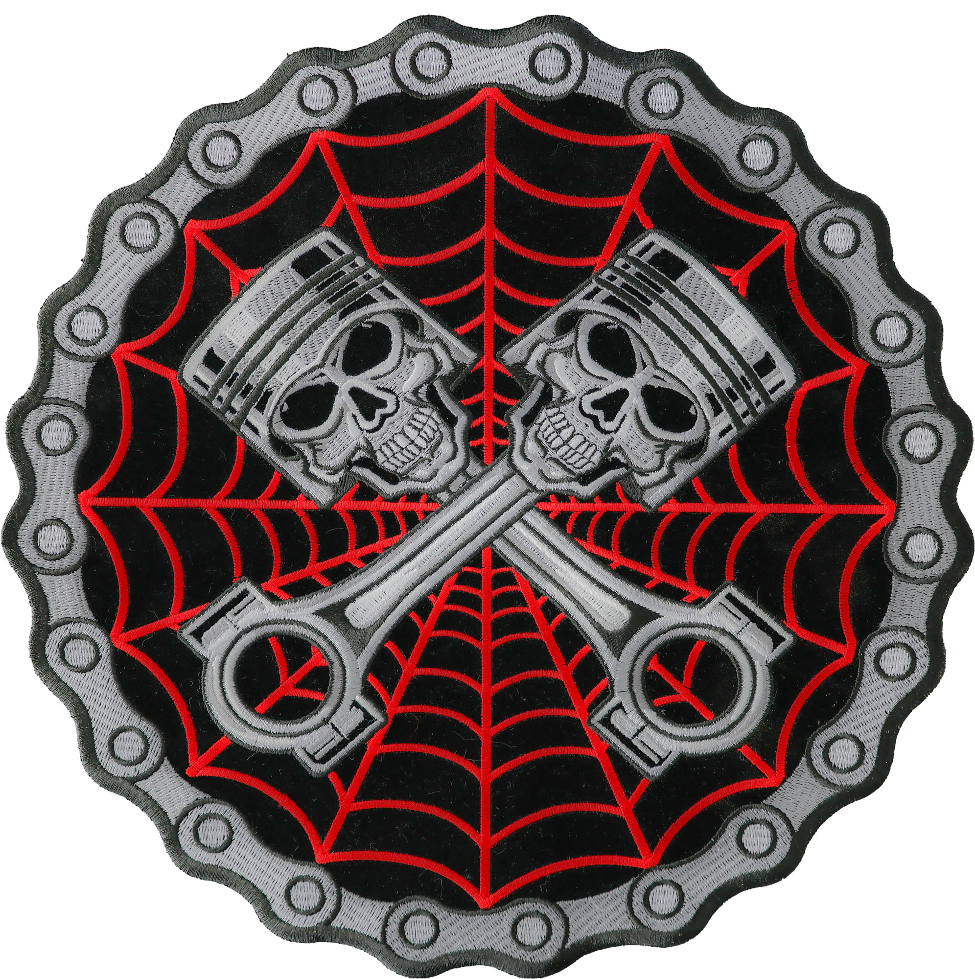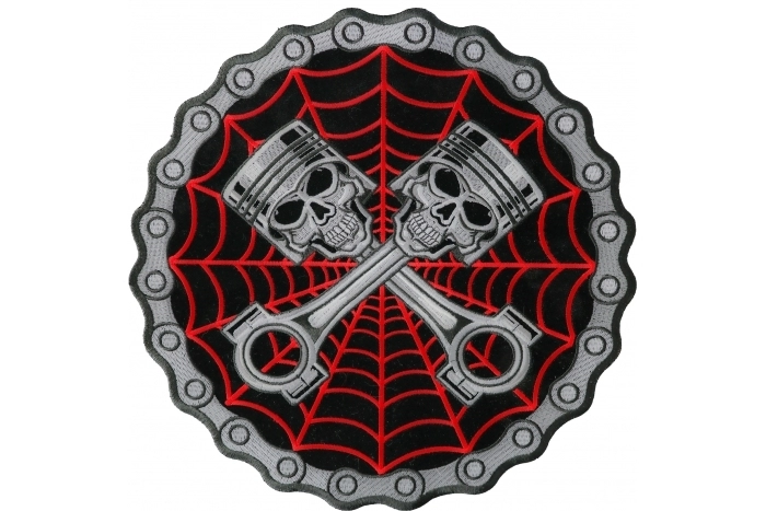 Piston Web Skulls Large Back Patch measures 11x11 inches and is Embroidered in Black / White / Red / Gray. The patch can be sewn on to Leather Biker Jackets, Vests or Chaps. The patch can also be ironed on to Shirts, Hats or Denim material such as Jeans. Features plastic iron on backing and clean laser cut embroidered borders. Japanese made iron on glue requires temperature between 270-290 Degrees Fahrenheit. Use a heat press for 30 seconds to adhere the patch permanently to your clothing. Using a regular household iron will probably not be as permanent as one hopes. If possible we recommend you sew on your patches for a more durable application. Never iron on patches to Leather or Nylon materials.