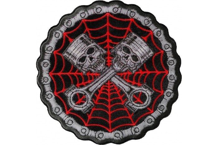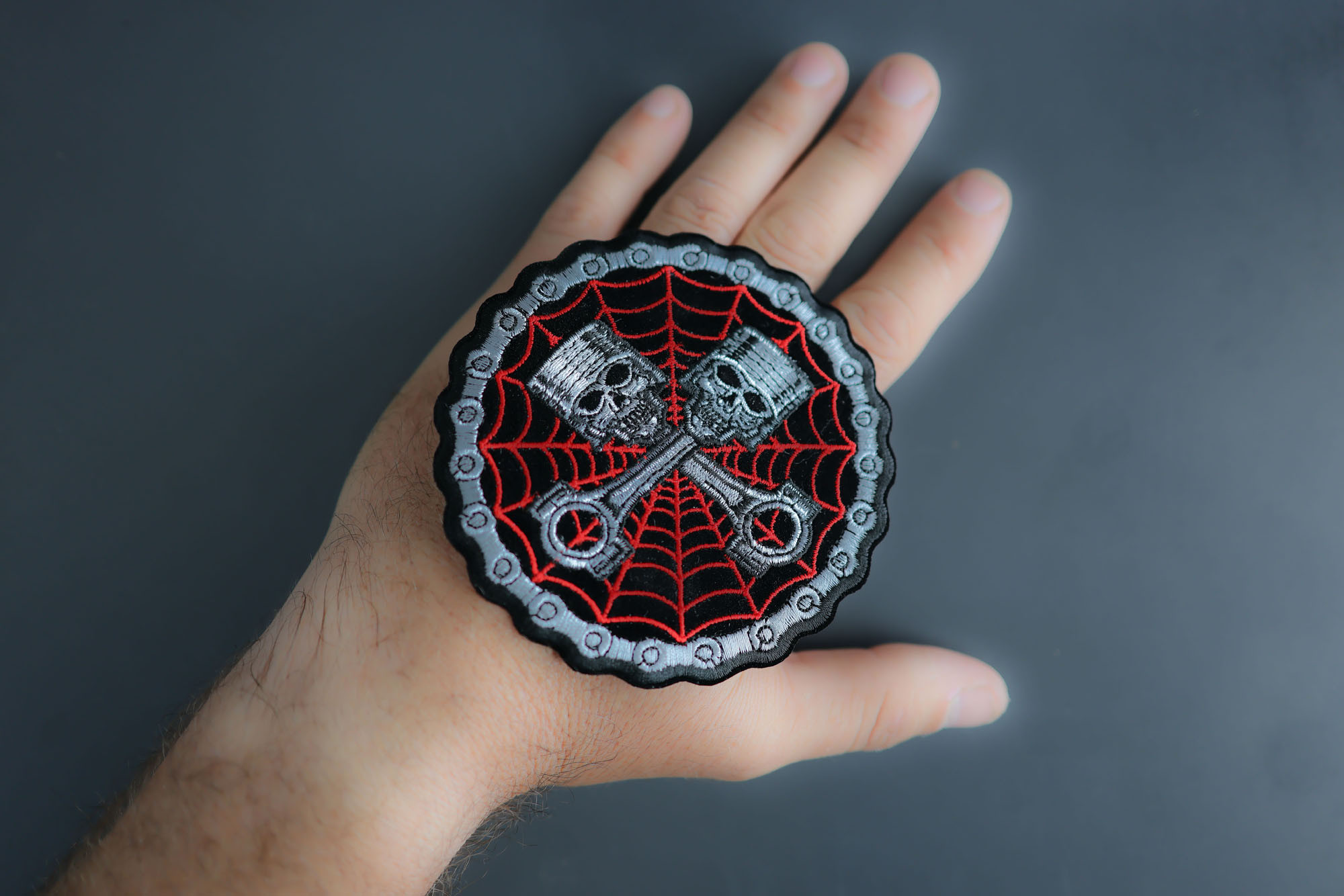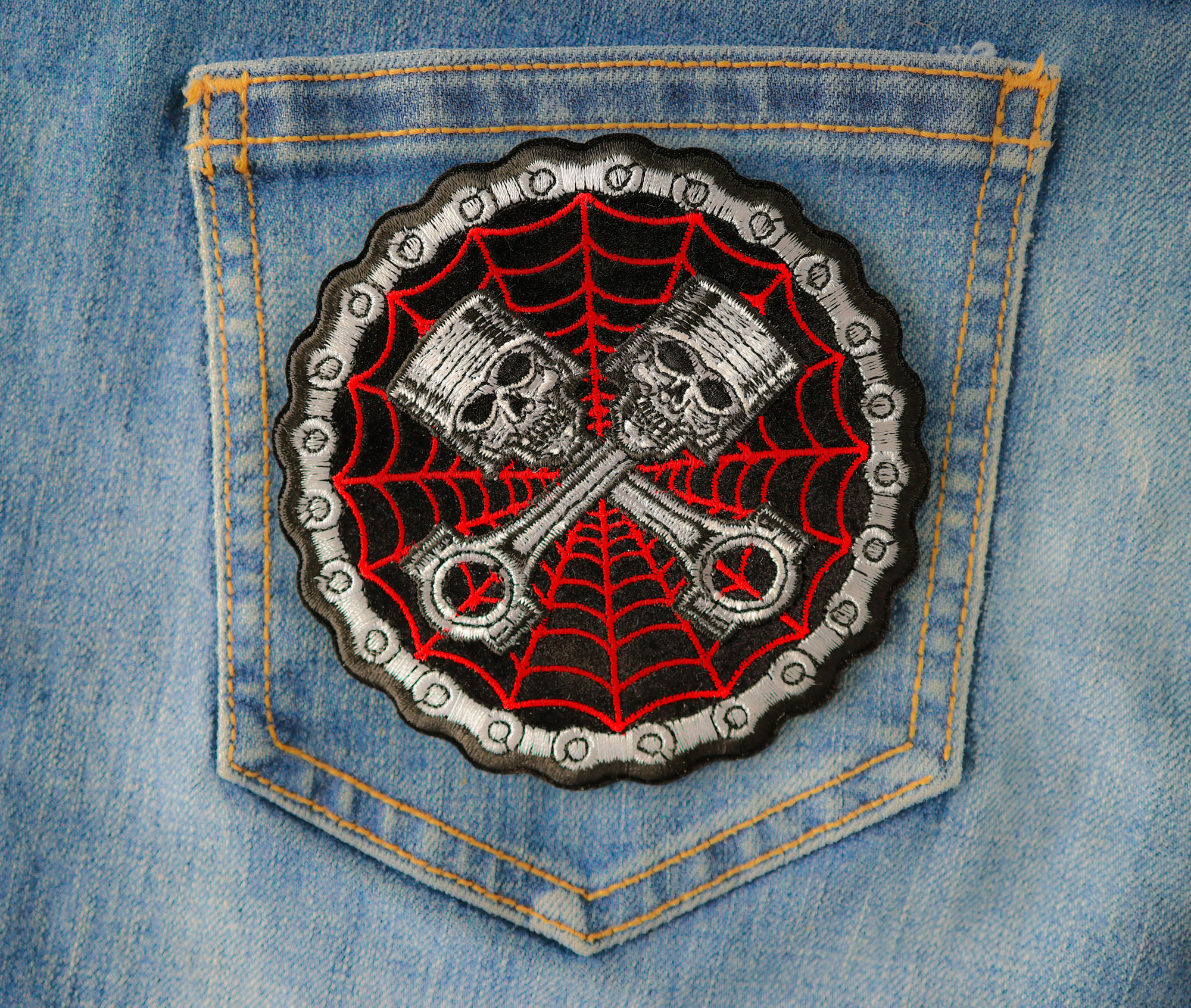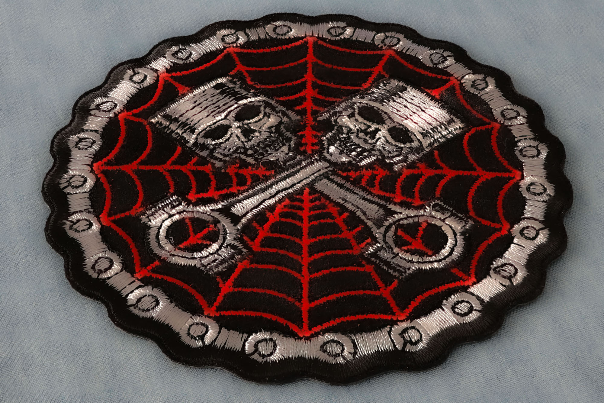 Piston Web Skulls Patch measures 4x4 inches and is Embroidered in Black / White / Red / Gray. The patch can be sewn on to Leather Biker Jackets, Vests or Chaps. The patch can also be ironed on to Shirts, Hats or Denim material such as Jeans. Features plastic iron on backing and clean laser cut embroidered borders. Japanese made iron on glue requires temperature between 270-290 Degrees Fahrenheit. Use a heat press for 30 seconds to adhere the patch permanently to your clothing. Using a regular household iron will probably not be as permanent as one hopes. If possible we recommend you sew on your patches for a more durable application. Never iron on patches to Leather or Nylon materials.