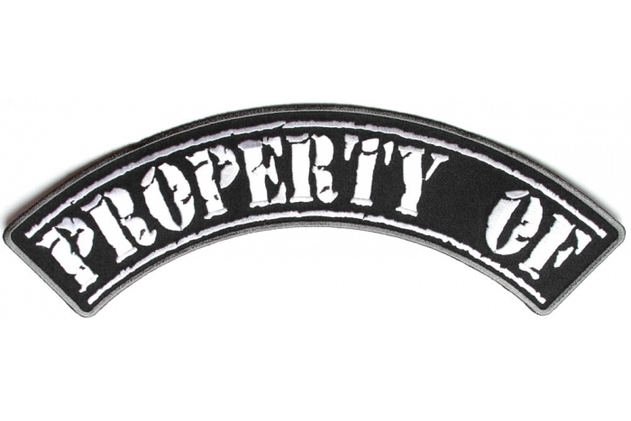 Property Of Large Top Rocker Patch measures 12x2.5 inches and is Embroidered in Black / White. The Large Patch can be sewn on or ironed on to clothing such as Denim or Leather Jackets, Vests, Hats, Back Packs, Shirts. Features plastic backing and embroidered die cut borders.