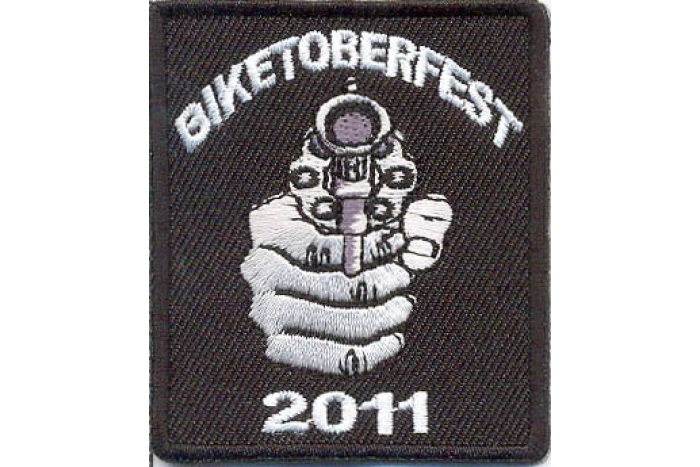 Biketoberfest 2011 patch with gun on hand. Measures 2x2.25 inches.