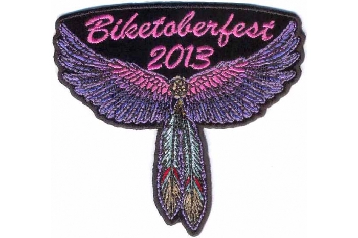 The 3.5x4 inch measuring embroidered patch for Biketoberfest 2013 annual Motorcycle Fall Rally in Daytona Beach. This iron on patch has pink and purple wings with a feather hanging off it embroidered in vibrant colors. A perfect patch for lady riders that've attended the 2013 Biketoberfest Motorcycle Rally in Daytona.