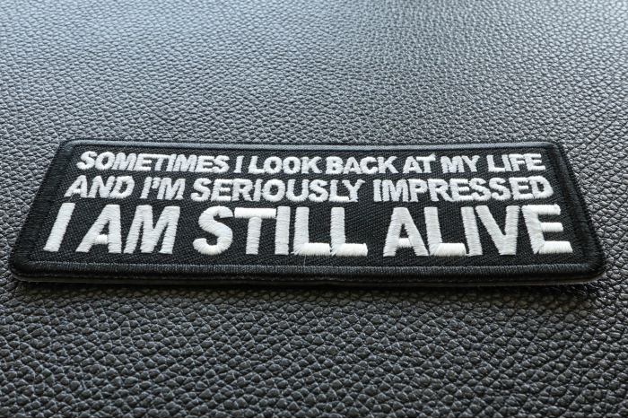 Sometimes I look Back at my Life and I'm Seriously Impressed I am Still Alive Patch measures 4x1.5 inches and is Embroidered in Black / White. The Small can be sewn on or ironed on to clothing. The Sometimes I look Back at my Life and I'm Seriously Impressed I am Still Alive Patch features plastic iron on backing and clean laser cut embroidered borders.