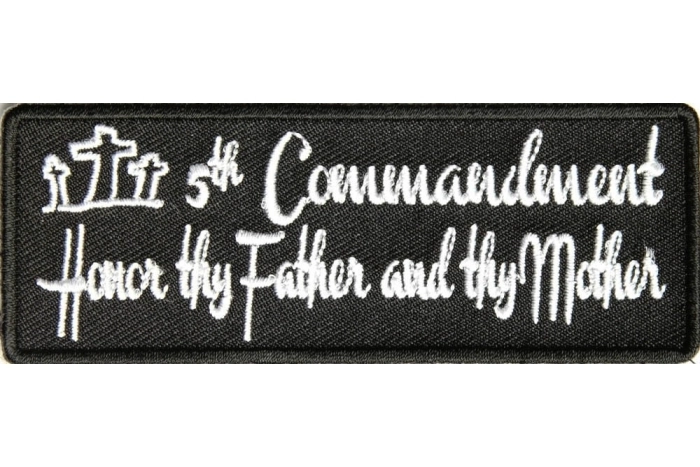 5th Commandment Patch is embroidered in white over black. Honor Thy Father and Thy Mother. Measures 4x1.5 inches.
