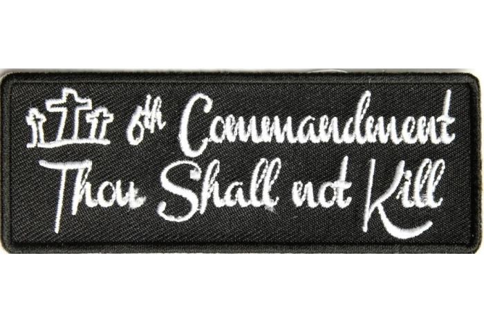 6th Commandment Patch is embroidered in white over black. Thou shall not kill. Measures 4x1.5 inches.