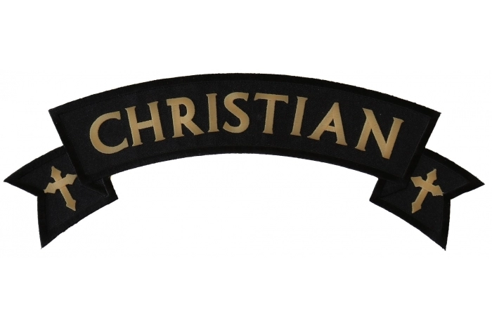 This 4 x 10 inch patch is perfect for those who are proud of their faith. It is a simple design which shows a black banner emblazoned with the word ‘Christian’ on it in stunning gold thread. It also features two Christian crosses at either end and will look superb on the back on any jacket or vest. The ‘Christian Rocker’ patch is perfect for applying to the top of your clothing and can be either ironed or sewn on with ease. However it is not recommended that you iron this patch on to leather clothing as it will damage your leather. Here is how it looks on a vest. This one was taken over a size 42 inch leather men's vest.