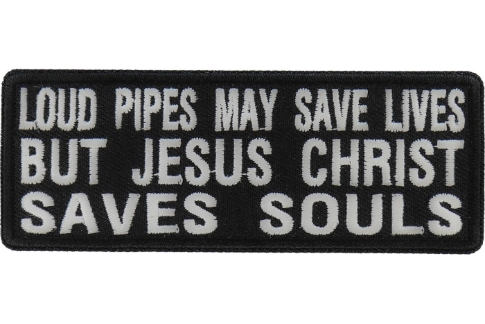 Loud Pipes May Save Lives But Jesus Christ Saves Souls Patch - 4x2 inch